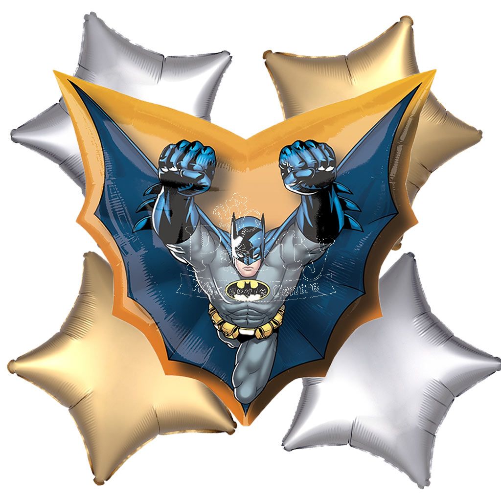 You don't need superpowers to throw a Batman Birthday Party for your little superhero! This five-piece Cape Batman Balloon Bouquet features the Heroic Caped Crusader with four solid colour star-shaped foil balloons tied together in a bunch!