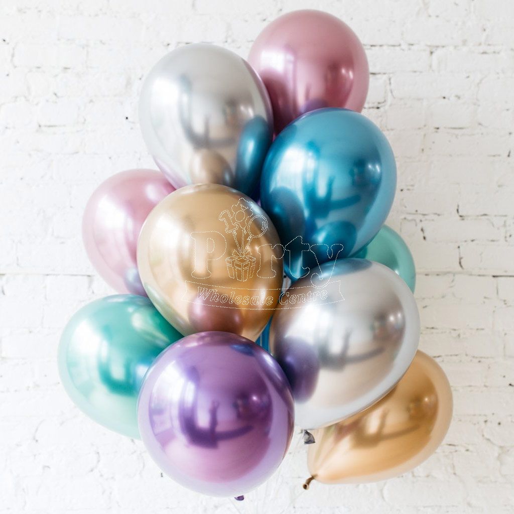 Surprise your special one with this beautiful bundle of chrome balloons in silver, gold, rose, mauve, green and blue colours.